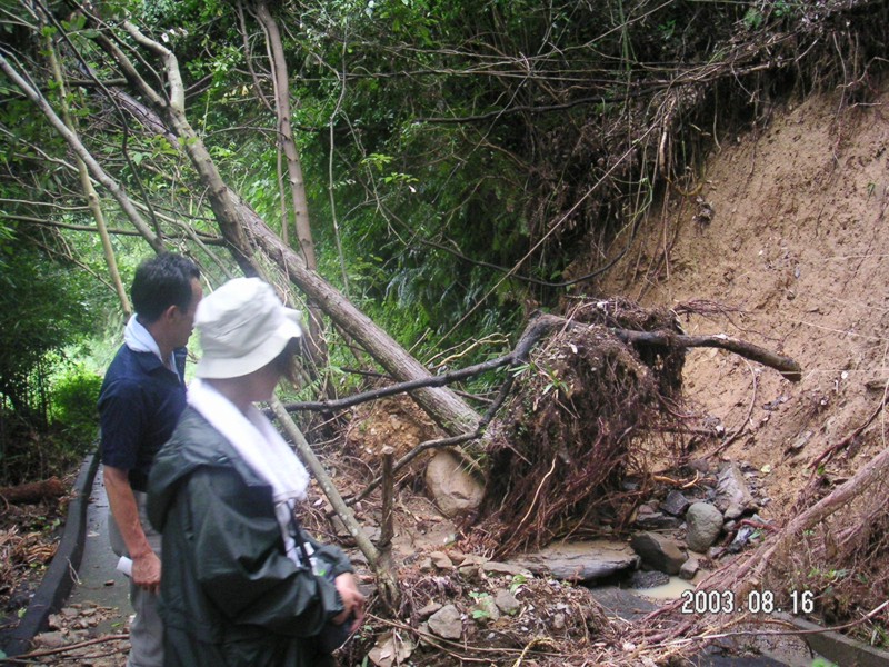 谷になっていて湧き水のあるところが崩れ落ちやすいところなのだが、崩壊している場所と同じような地形のところでも、天然林のところではほとんど表層が流れずに残っているという場面も見ることが出来た。