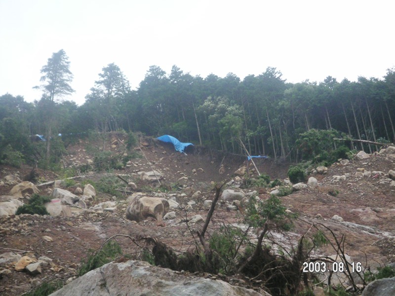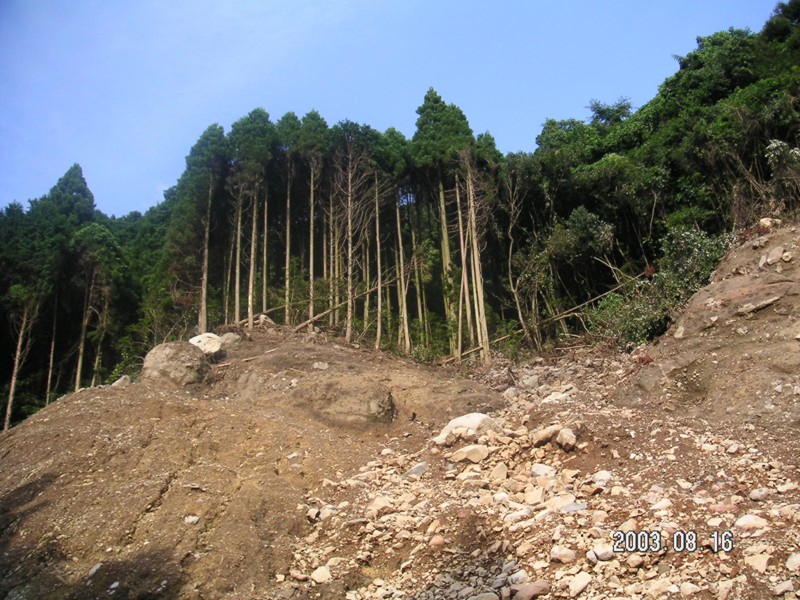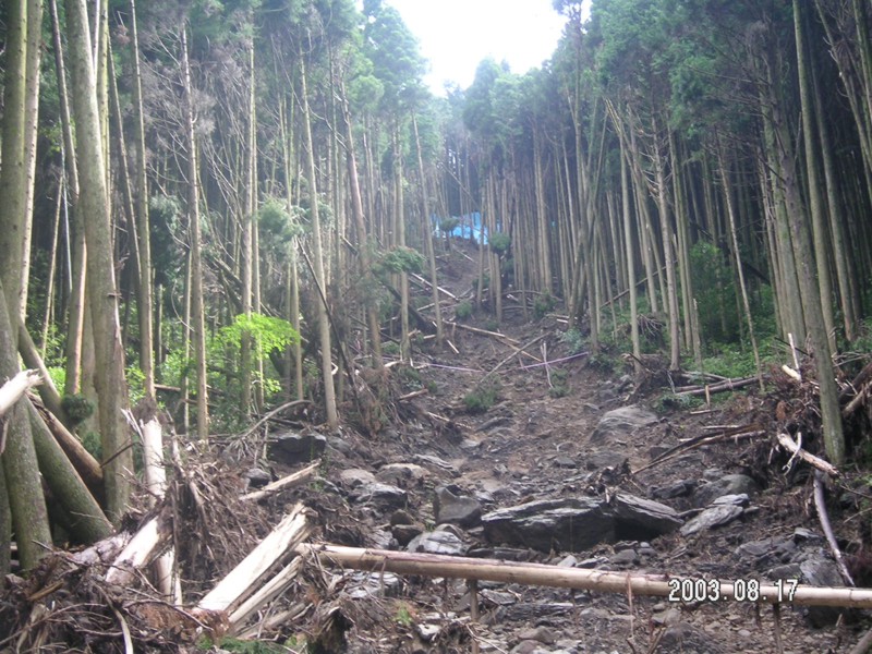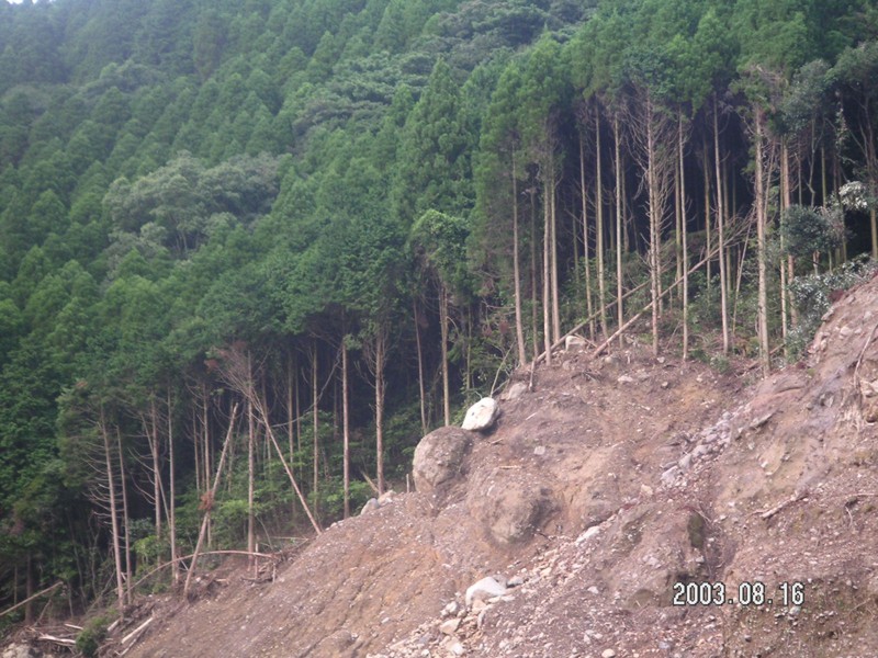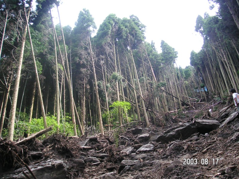 宝河内地区崩落の一番上は、痩せた手入れの出来ていない杉の人工林。