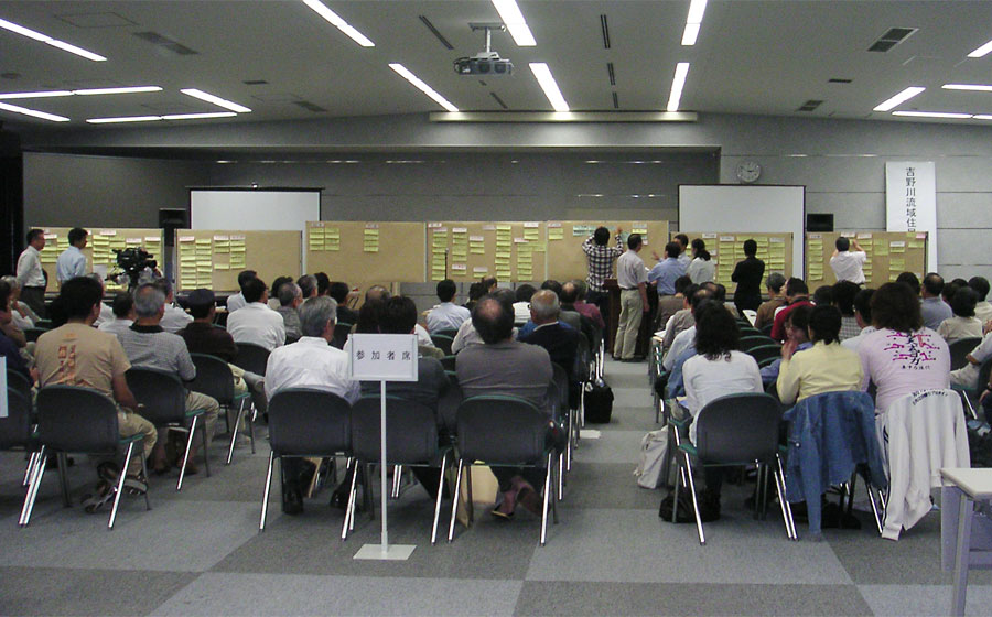 しかし、この日は「すべての人の意見を聞いたぞ」としたかったのか、一人5枚のポストイットが配られ(縦横それぞれ5×20cmほどの黄色い用紙)、それに自分の意見を書いて前にあるホワイトボードに貼り付けていく、というやり方だった。ホワイトボードは「治水」「利水」「環境」などに分類されている。なるほど、参加型ワークショップでよく使われる手法だ。住民に共同作業をしたという満足感を与え、参加したという意識にさせるのだな。徳島の人は騙されないと思うけど。